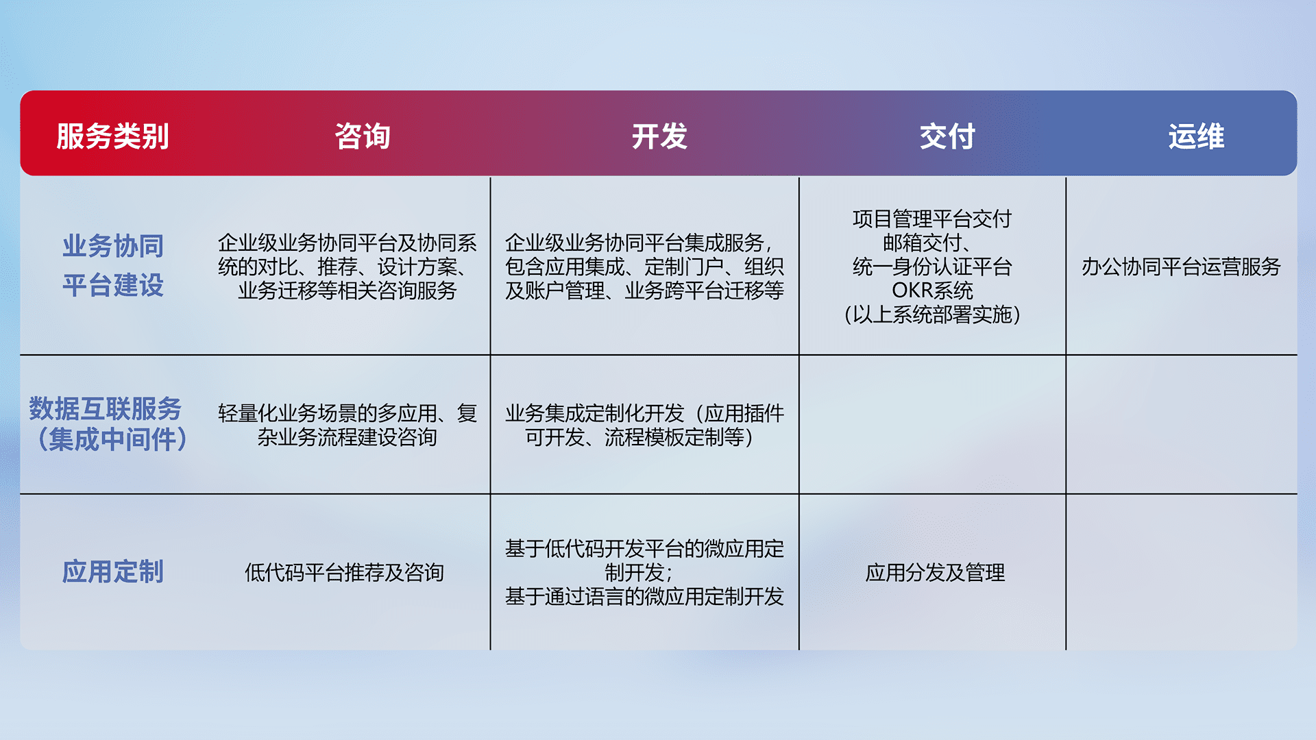针对钉钉、、、、企微、、、IDaas等平台级产品提供产品的规划、、、方案、、交付、、定制化开发等服务,,实现如统一协同办公、、、、智能客户服务、、混合会议管理、、、智能数据查询、、、、等业务场景,,实现数字化转型。。。。
