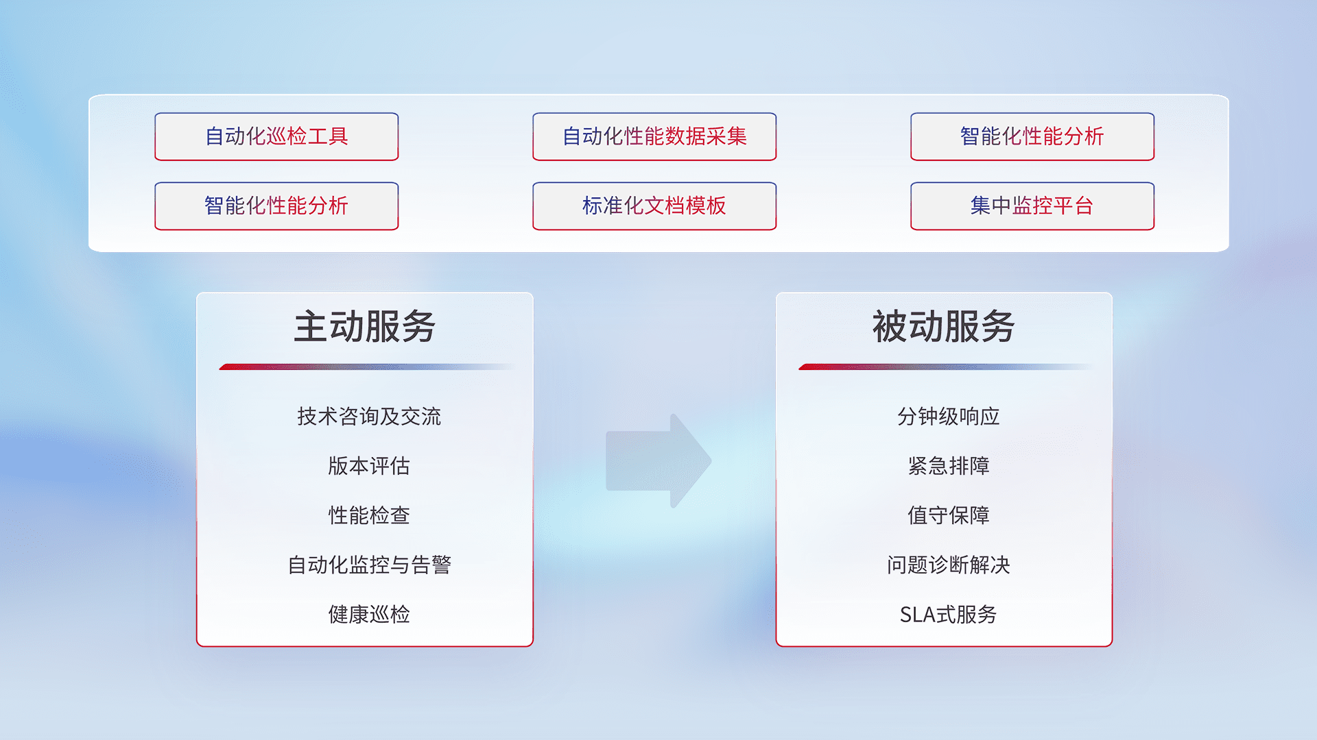 智能化工具和标准化文档,,保障服务质量,,提供主动服务(包含技术咨询、、版本评估、、、性能检查、、、、自动化监控与告警、、健康巡检)和被动服务包含(分钟级响应、、、、紧急排障、、值守保障、、问题诊断解决、、、SLA服务)。。